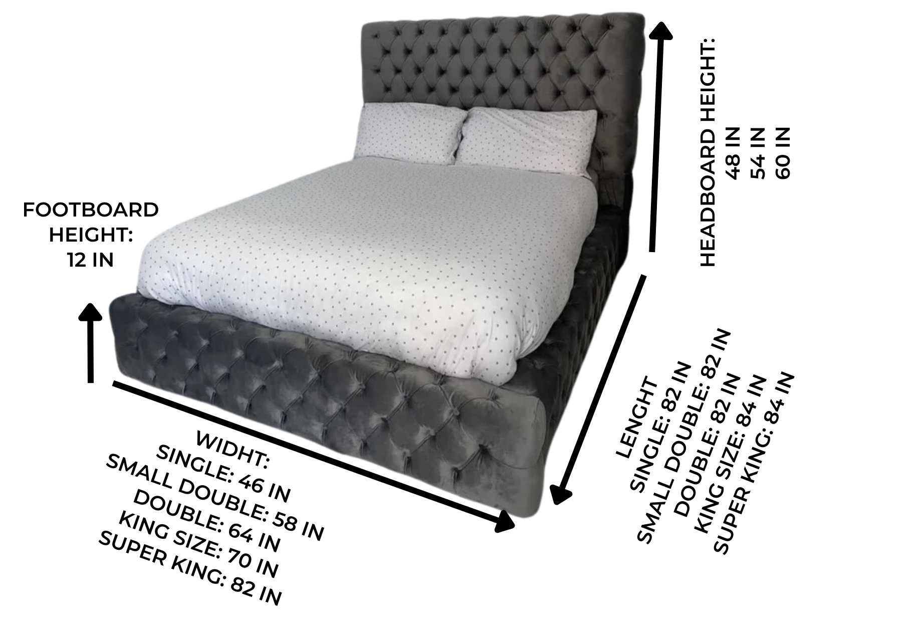 The grand Ambassador bed can be purchased in our variety of premium fabric choices, including Crushed Velvet, Plain Velvet (Plush) and Chenille (Fabric material). Whether you are looking to create a glamorous or sophisticated bedroom, we have a large range of fabric choices to suit your individual needs. We stock all the popular grey, silver, cream or black materials for all our handmade upholstered beds.
