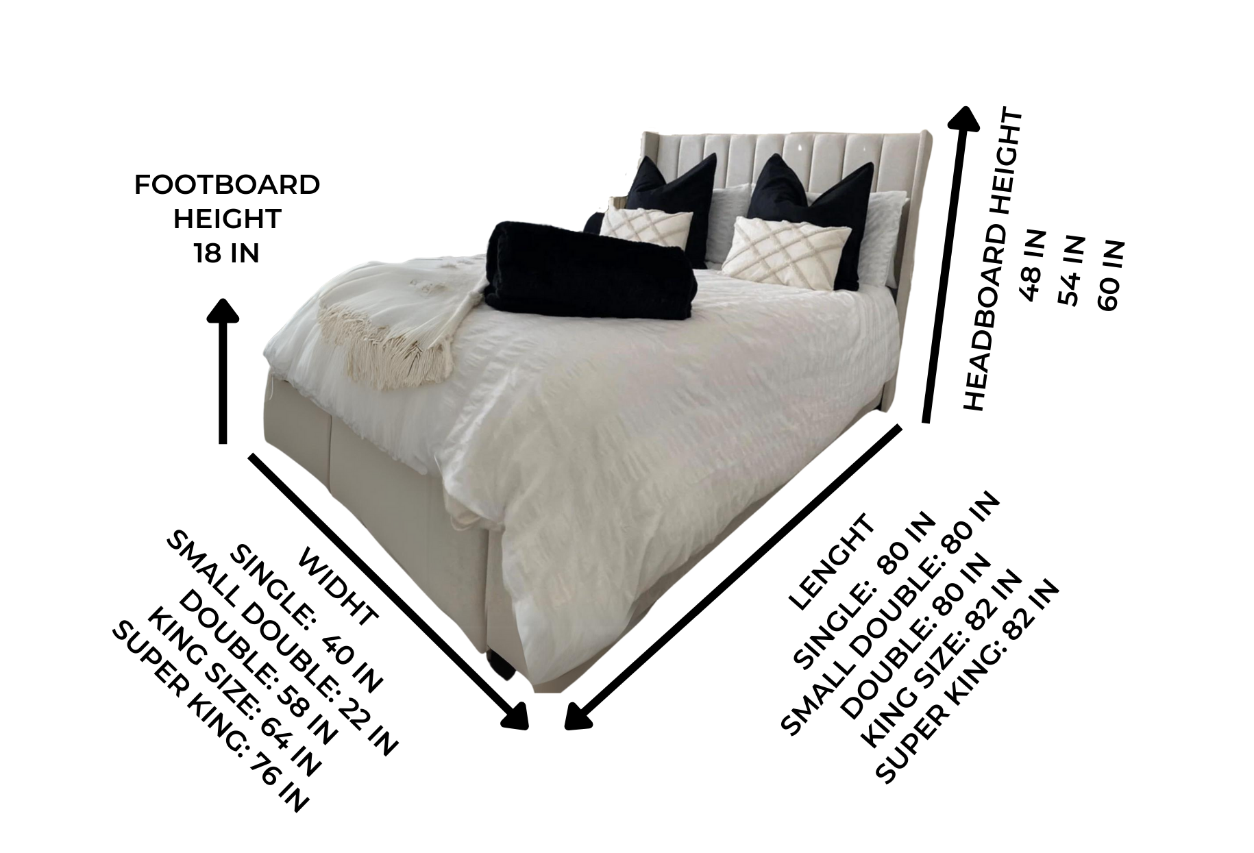 The grand vertical lines Bed bed can be purchased in our variety of premium fabric choices, including Crushed Velvet, Plain Velvet (Plush). Whether you are looking to create a glamorous or sophisticated bedroom, we have a large range of fabric choices to suit your individual needs. We stock all the popular grey, silver, cream, or black materials for all our handmade upholstered beds.