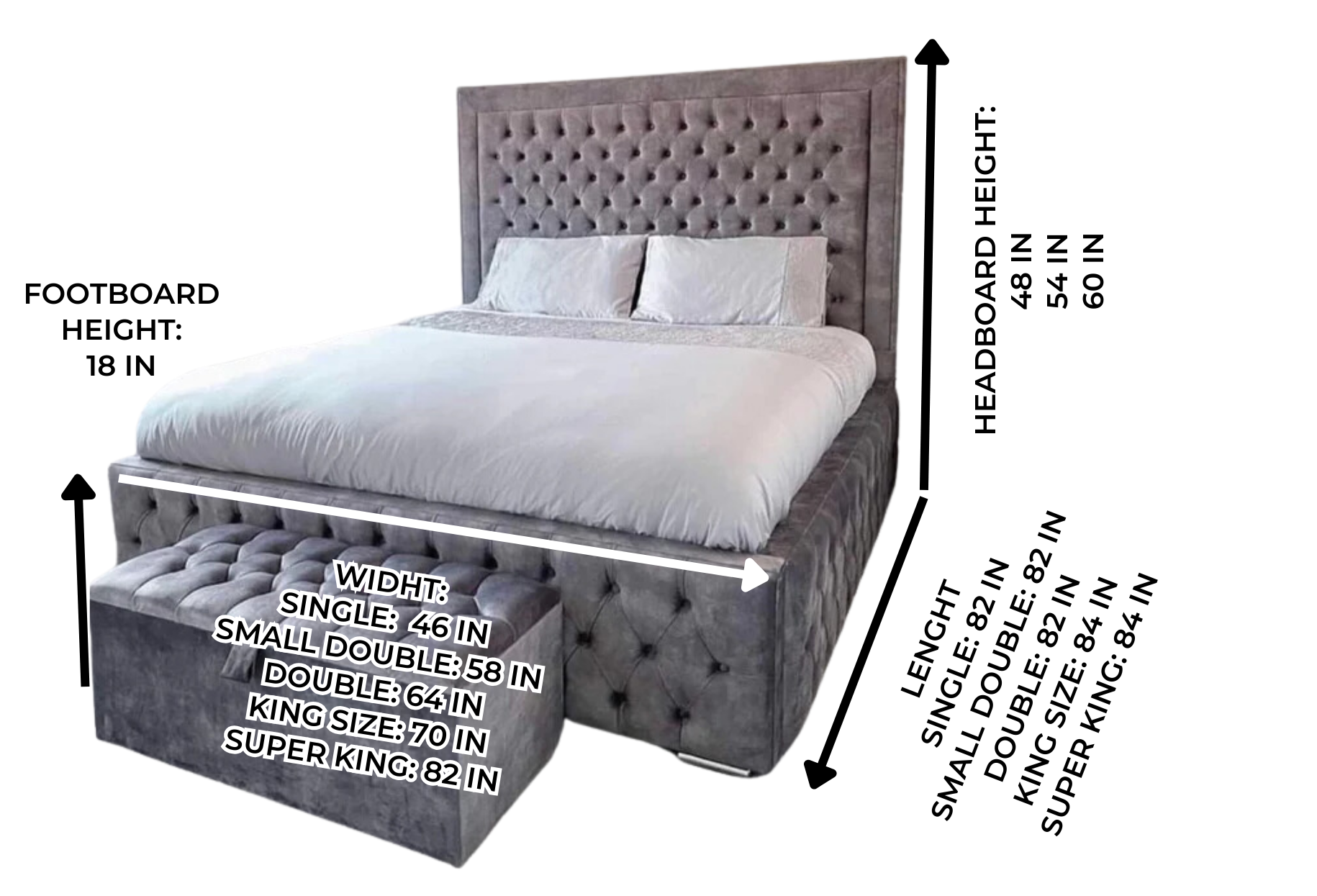 The grand Houston Bed can be purchased in our variety of premium fabric choices, including Crushed Velvet, Plain Velvet (Plush), and Chenille (Fabric material). Whether you are looking to create a glamorous or sophisticated bedroom, we have a large range of fabric choices to suit your individual needs. We stock all the popular grey, silver, cream, or black materials for all our handmade upholstered beds.