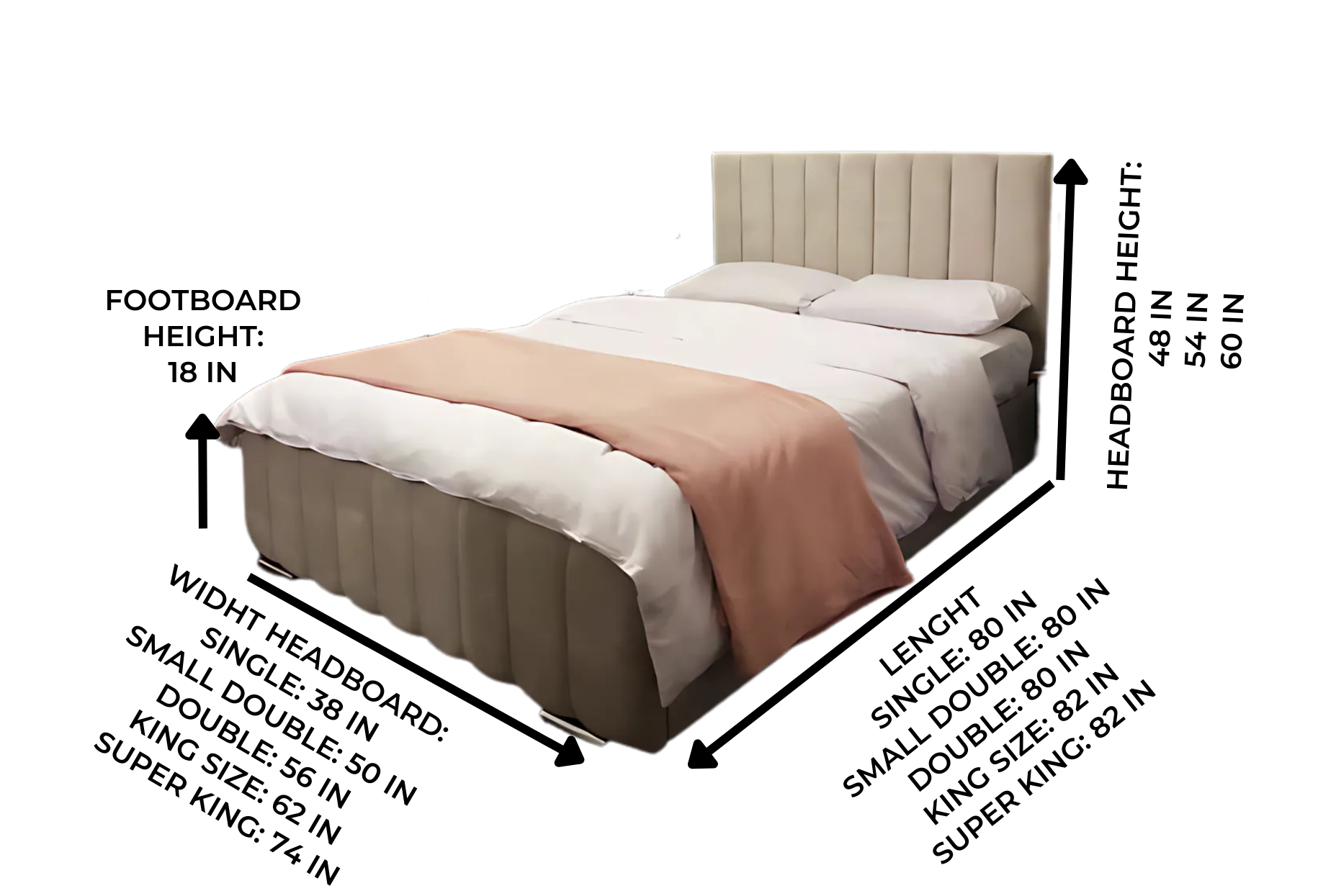 The Vertical Lines Panel Floor Standing Tall Headboard Gas lift Front or Side Ottoman Storage Bed Frame is a new addition to our ever-growing bespoke bed collection. The bed is a bespoke made-to-order bed that is UK-made. The bed features a vertical line design on the headboard. The bed has been manufactured by upholsterers with many years of experience. The bed is available to order in any size, fabric, or color. You can have a front opening ottoman base. The bed complies with all regulations and requires simple self-assembly. The bed comes in 3 pieces.